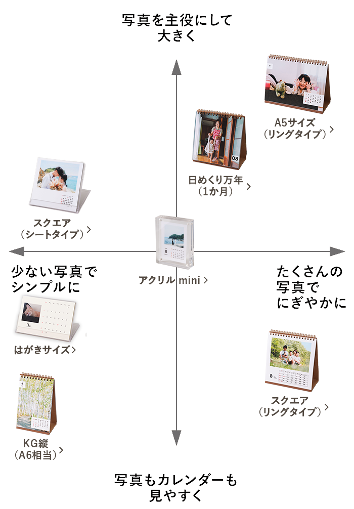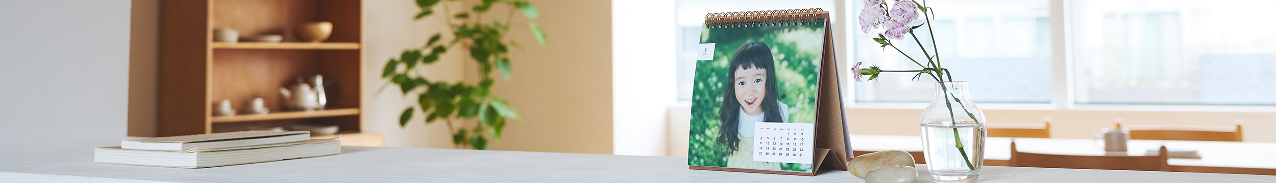 カレンダーとして使い終わっても、アルバム感覚で写真を長く楽しめるのがオリジナルカレンダーの魅力。卓上カレンダーはリング製本タイプやケース入りで、長く保管しやすい形状です。「直近1年間の写真で毎年つくる」などと決めておけば、将来見返したときにカレンダーの日付から大体の撮影時期がわかるので、子どもの成長記録としても残せます。
