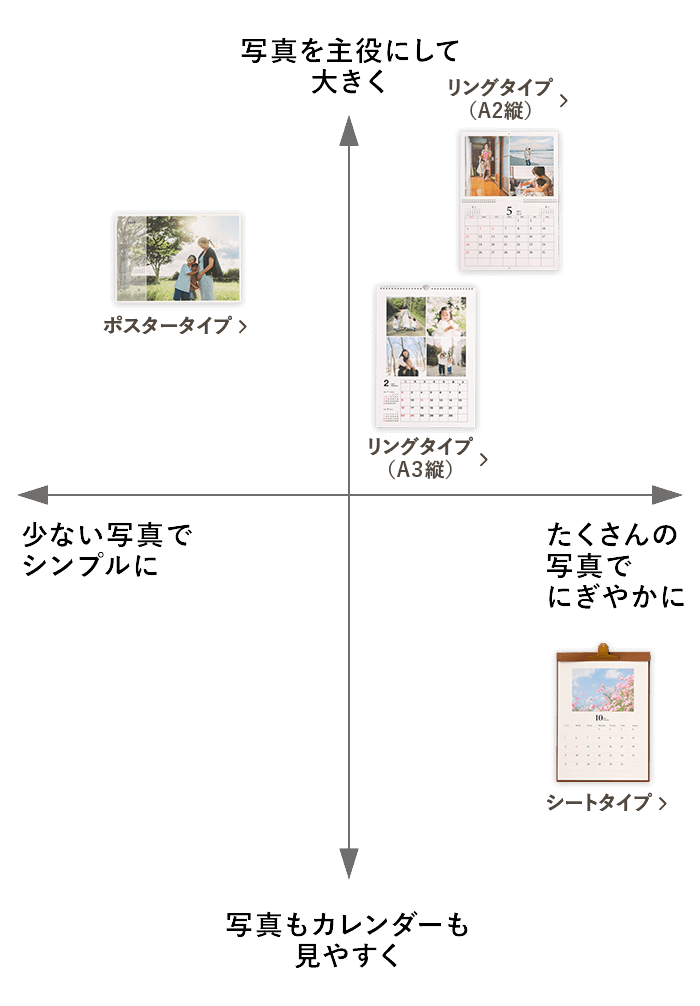 壁掛けカレンダー リングタイプは印刷仕上げのカレンダーであり、鉛筆やペンでの書き込みを想定した厚みのあるマット紙を使用しています。ポスタータイプの写真仕上げは光沢紙を使っているため、鉛筆の書き込みには適していません。