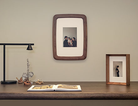 「+precious」商品は、生活にとけこみやすく、主役の写真の魅力をより引き立たせるシンプルでスタイリッシュなデザインを大切にしています。どんなスタイルのお部屋にも合わせやすく、インテリアとしてプラスしたくなるような商品を提供します。