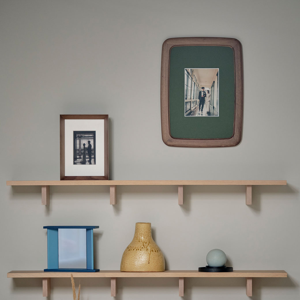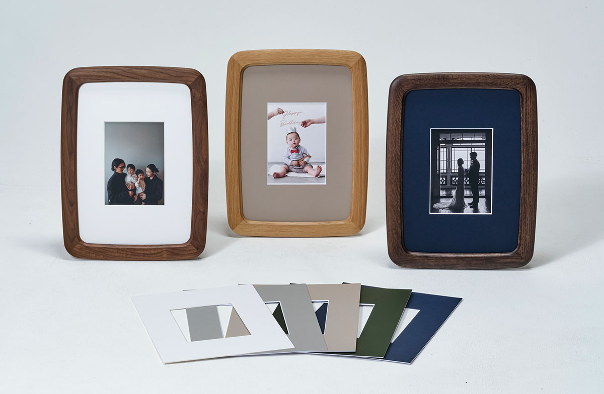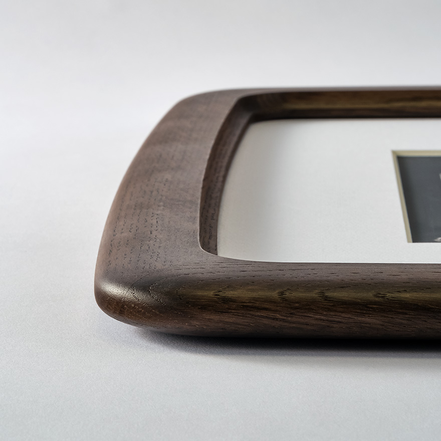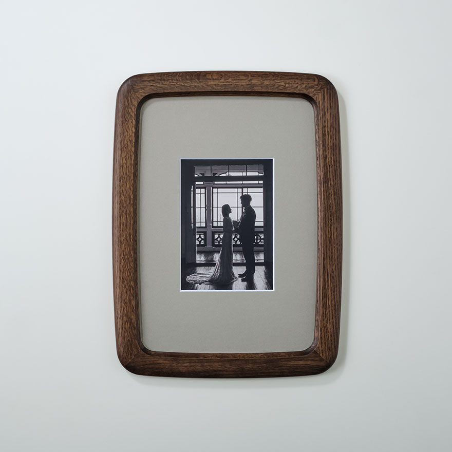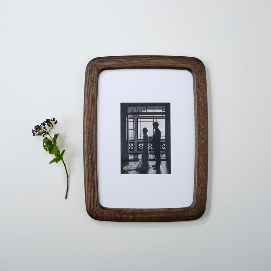 ナチュラルマークがフレームの細部に現れ思い出を彩る国産「オーク材」を採用、シックなインテリアにマッチする「スモークドオーク」塗装仕上げ。木を燻す加工を再現した塗装色で、材色や木目が際立つ、木を染めたような風合いです。
